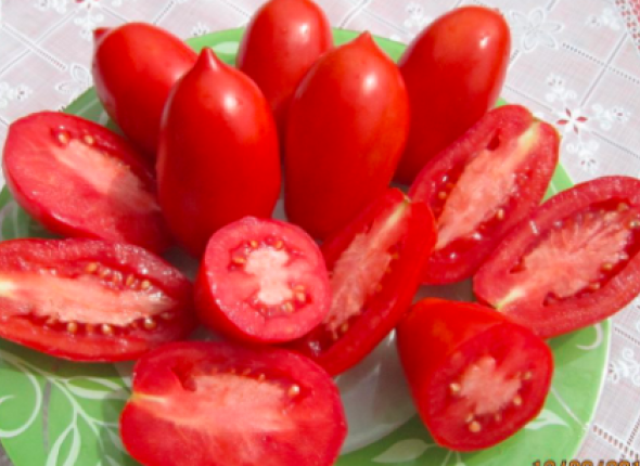 Кусты у него низкие и компактные — обычно до 40–50 см в высоту, с крепкими прямостоячими стеблями, которые выдерживают нагрузку от урожая без поломок. Плоды удлинённо-овальные, ярко-красные, плотные и мясистые, весом около 60–65 г. Они устойчивы к растрескиванию, хорошо транспортируются и подходят как для свежих салатов, так и для засолки, консервирования или переработки