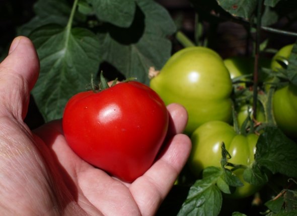 Крупноплодный сорт с сердцевидными плодами весом до 500 г. Мякоть мясистая, семян мало, вкус сладкий без кислоты. Не подходит для цельноплодного консервирования, но идеален для свежих салатов и соков. Урожайность средняя, но вкус компенсирует количество.