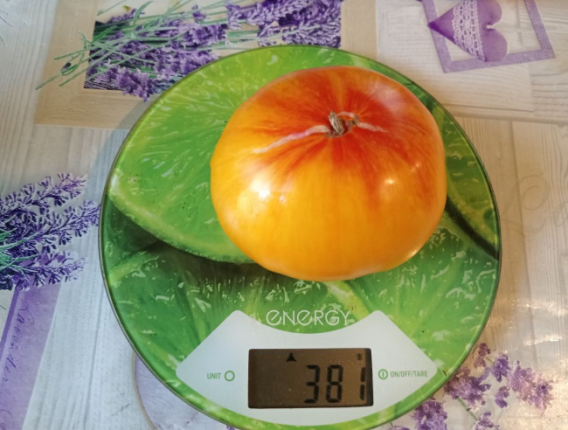 Особенность сорта — необычная окраска. Снаружи помидоры имеют оранжево-золотистый оттенок с розовыми штрихами, а внутри мякоть ярко-оранжевая с контрастными полосками. Благодаря этому томаты выглядят эффектно в свежих салатах.