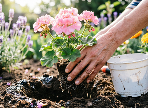 Летом герань можно пересадить из горшков в открытый грунт. На свежем воздухе растение становится крепче, листья приобретают более насыщенный оттенок, а цветение становится пышнее.
