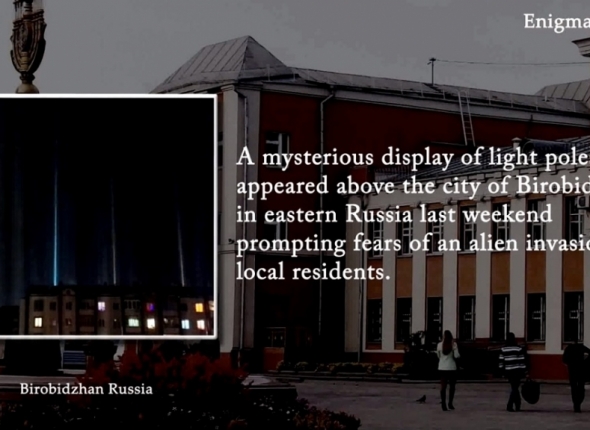"Таинственные столбы света появились над городом Биробиджан в восточной части России в минувшие выходные, вызвав у местных жителей опасения об инопланетном вторжении. Странные разноцветные свечения, вспыхнувшие на фоне ночного неба, были приняты тысячами горожан за посещение пришельцами из другого мира. Один житель сказал: