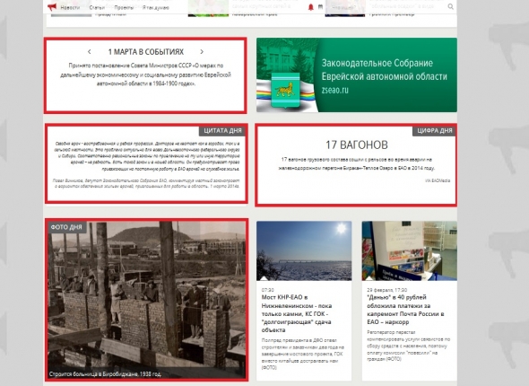 EAOMedia, 3 марта 2016. Новый информационный блок, посвященный истории региона, появился накануне на сайте ИА EAOMedia. Каждый день в рамках проекта читатели информагентства смогут познакомиться с "Цифрой дня", "Фотографией дня", "Цитатой дня" и "Событием дня", передает корр. ИА ЕАОMedia. Большую помощь в подготовке этого исторического блока редакции оказывает областной краеведческий музей и областная научная библиотека им.Шолом-Алейхема. Редакция информагентства надеется, что свою лепту в воспитание не показной, а настоящей любви к родному краю окажет и госархив ЕАО, в котором собрано немало инереснейших материалов.