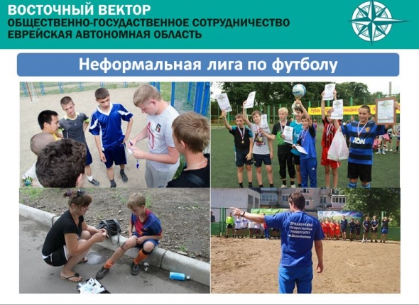 — На протяжении пяти лет наша молодежная организация реализует проект "Неформальная лига по футболу". Мы собираем мальчишек из разных уголков Биробиджана, объединяем их в футбольные команды и проводим между ними соревнования. Большинство этих ребят из группы риска или малообеспеченных семей. Активное занятие спортом, систематические тренировки не дают им увлечься вредными привычками и заняться криминалом, — начал свою презентацию Егор Мерингер.