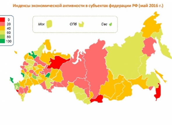 От 80% до 100% в оценке уровня экономической активности показали Белгородская и Ленинградская области, Краснодарский край, Удмуртия, Пензенская область и Крым с Севастополем.