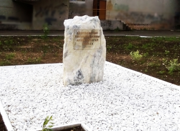 — Это наша благодарность именно биробиджанским архитекторам. Сам камень к нам привезли с доброй руки главного инженера ГОКа. Как только мы ему позвонили, он сразу выбрал несколько видов камней. Нам оставалось только подъехать и выбрать подходящий. Надпись для камня — "Благодарные биробиджанцы архитекторам города" — мы придумали сами (решили, что будет так), а нанести ее помог один из местных предпринимателей, — поведала Ольга Холова.
