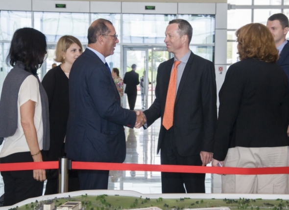 Знакомство с ДВФУ началось с осмотра макета второй очереди кампуса. Ректор рассказал о действующей и планируемой к возведению инфраструктуре, включающей учебные, жилые, научно-исследовательские корпуса и спортивные объекты. Повышенный интерес Цви Хейфеца вызвали Медицинский центр и Школа биомедицины, которые, как подчеркнул Сергей Иванец, работают в тесном контакте, обеспечивая связь образования, науки и медицинской практики.