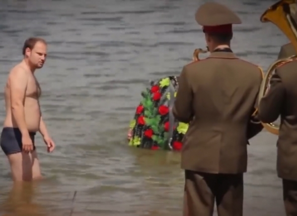 Когда тот заходит в воду, на берегу появляется духовой оркестр и начинает играть похоронный марш. Одновременно из воды выныривают аквалангисты с траурными венками, а два других участника флешмоба (работники ОСВОДа) разворачивают транспарант с красноречивой надписью – "Вечная память нетрезвым купающимся".