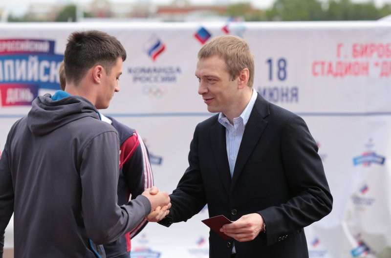 — Уважаемые спортсмены, тренеры, участники, организаторы олимпийского дня в Еврейской автономной области. Поздравляю вас с большим спортивным праздником. Уже скоро мы будем болеть за наших спортсменов и поддерживать их на предстоящих олимпийских играх в Рио-де-Жанейро. Сегодняшней поддержкой на этом празднике давайте зарядим нашу команду на победу. Среди наших земляков пока нет участников Олимпийских игр, но у нас есть славные традиции и мы понимаем, что это вопрос времени. В области немало успешных спортсменов, среди них, например, уже известный боксер Дмитрий Нестеров, я уверен, его ждет олимпийское будущее. Возможно, сегодняшние участники олимпийского дня в будущем примут участие в олимпийских играх. Самое главное, что количество спортсменов в нашей области и нашей стране растет с каждым годом, государство многое для этого делает. Одним из таких важнейших шагов было возрождение комплекса ГТО, — сказал Алексей Куренков. Затем он вручил 10-ти выпускникам школ областного центра, Биробиджанского, Ленинского и Облученского районов золотые и бронзовые знаки комплекса "Готов к труду и обороне".
